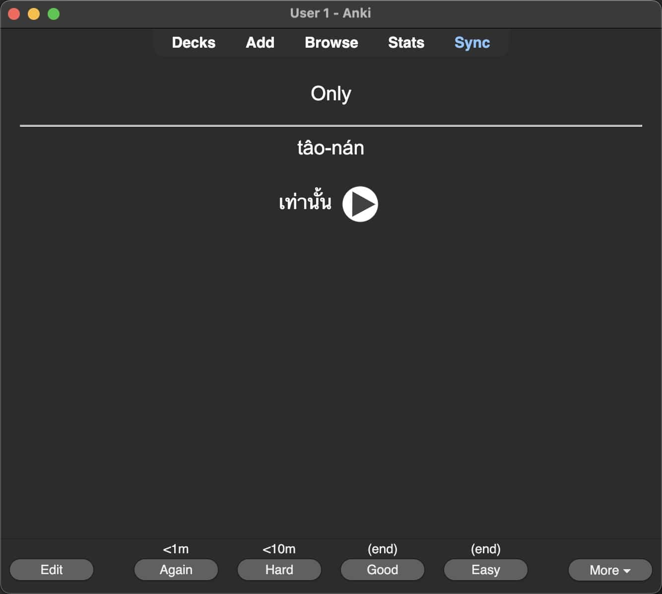 You can use Anki to create your own deck of cards. The program shows you one side of a card (front) at random, and you have to guess the other side (back). For example, it might display “toilet” on the front, and you need to recall “hôrng-náam.” After clicking “show answer,” you’ll see the back side to check if you were correct. Anki then offers four buttons: “Again” (shows the card again soon), “Hard” (shows it much later), “Good,” and “Easy.” These options help the algorithm prioritize difficult words so you see them more often than those you’ve already mastered.