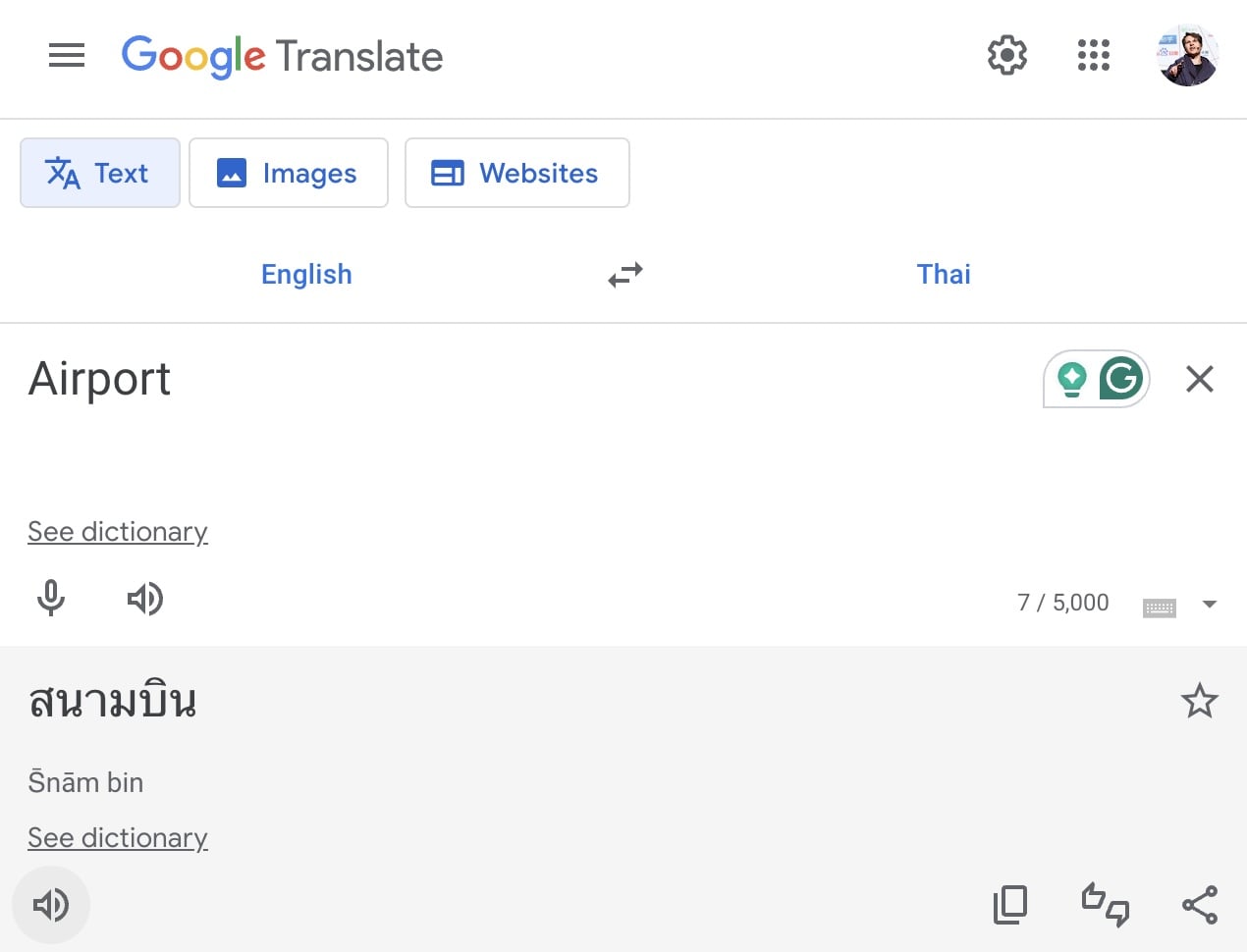 - Add hints: For example, “airport” (สนามบิน) can be broken down into สนาม (field) and บิน (fly). If the teacher explained this in class, I write it in the hint field. Otherwise, I use Google Translate in “Thai to English” mode and experiment by removing parts of the word to see the meaning of individual components.